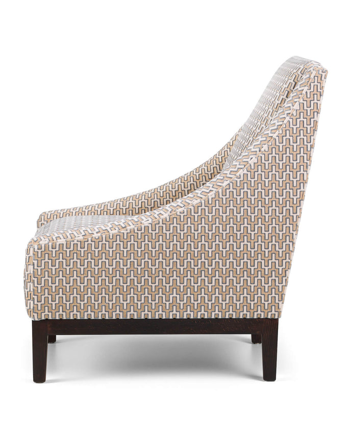 he Ashfield Chair, a striking chair with a contemporary edge, featuring a flat sprung back and seat, polished plinth and tapered wood legs.