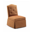 The Bedroom Chair, features a shallow-buttoned back with polished, tapered wood legs and kick pleat valance.