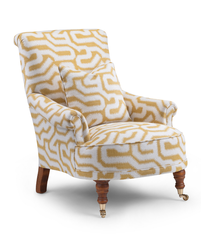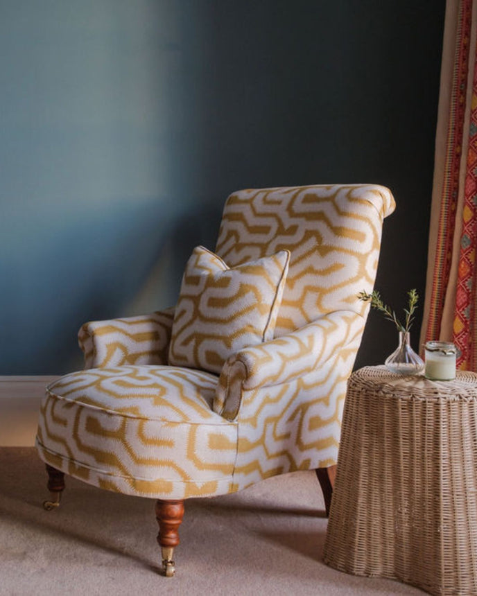 This Fireside Chair features a fixed seat and back, and Antique Brushed Oak Legs with Brass castors. It is upholstered in Rapture & Wright’s Albaicin, its Moorish-inspired pattern brings energy and character to any space.