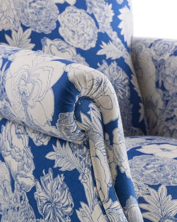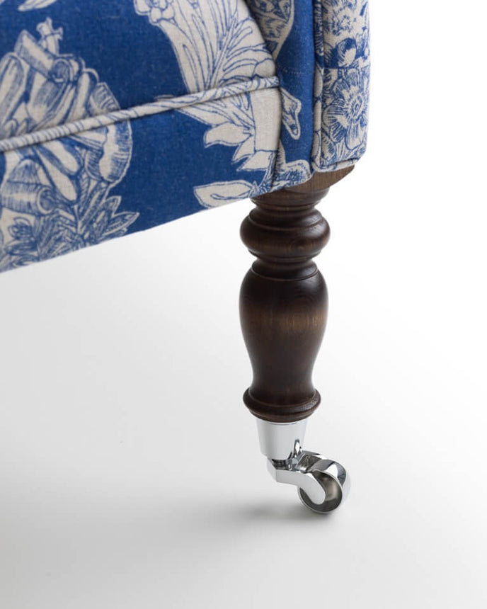 The Liberty Chair, a fine looking chair with a comfortable sprung back and seat and set back, scrolled arms. This attractive chair has turned legs in solid wood and a fitted brass or chrome castor foot.