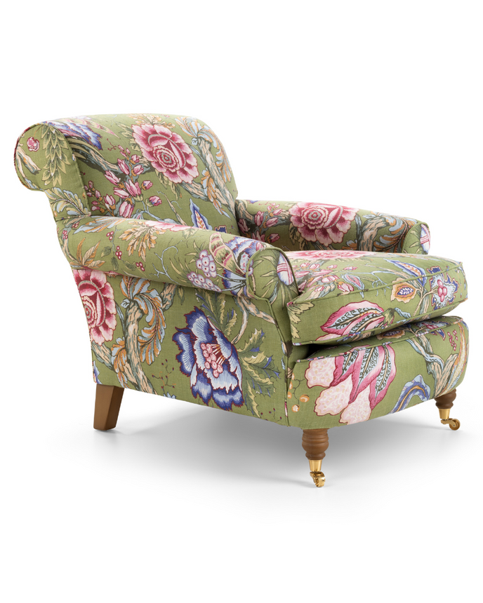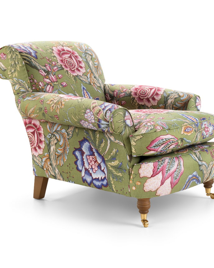 Upholstered here in a bold Manuel Canovas print, the chair’s generous proportions and sculptural silhouette create an inviting statement—equally suited to a cosy reading corner or a characterful living space. The Philip Arthur is more than just a chair—it’s a story, a legacy, and a celebration of craftsmanship.