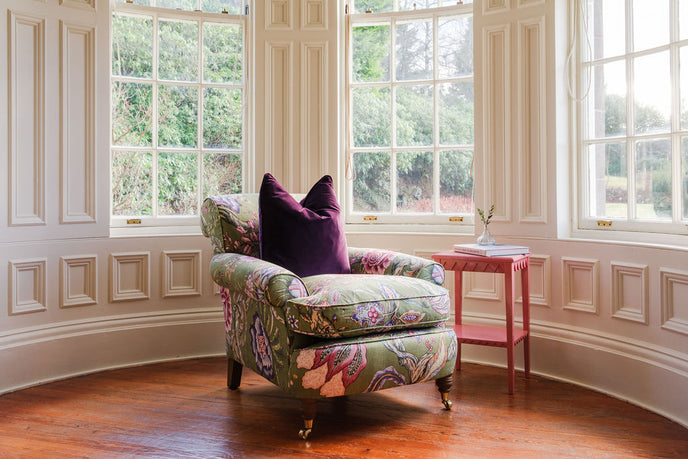 This Phillip Arthur Chair features a feather & down seat cushion, turned legs in a Light Walnut coloured polish & Brass castors. It is upholstered in Octavie by Manuel Canovas, a rich floral linen.