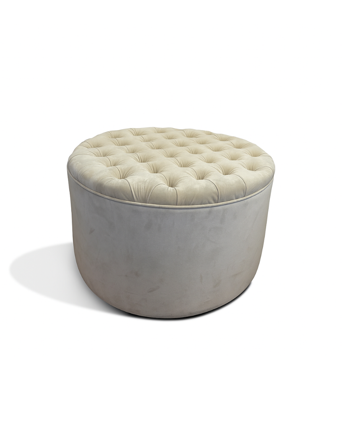 This Round Ottoman featuring a deep buttoned top is a stylish and practical addition to any space. It is upholstered in Omega Velvet in Biscuit by Linwood, a sumptuous yet hard wearing fabric.