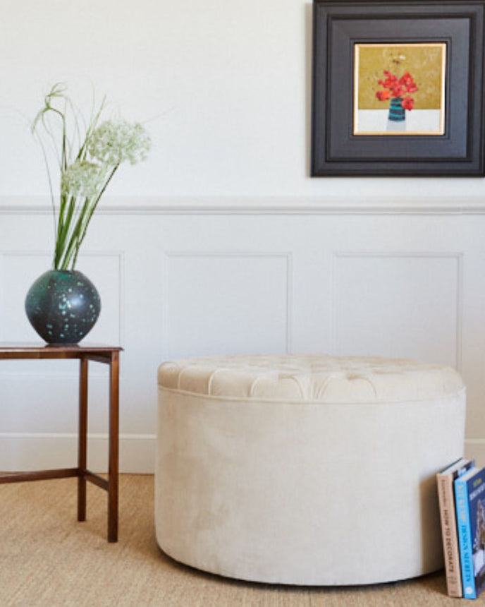 The Round Ottoman, featuring a deep buttoned top is a stylish and practical addition to any space.